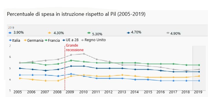 Il punto di domanda dopo la parola “spese” è volutamente inserito a sottolineare la non neutralità dei termini che utilizziamo. “Le parole sono importanti” diceva Nanni Moretti in un suo film perché connotano in partenza e definiscono una situazione. Parlare pertanto di spese per l’istruzione e l’educazione e inserire a bilancio dello Stato o degli Enti Locali nella voce uscite quanto viene stanziato per tali voci è di per sé un giudizio: i finanziamenti su questi capitoli sono debiti per le casse e quindi vanno ridotti!