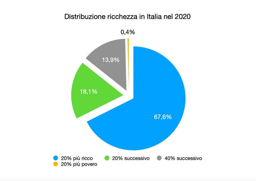 L’Italia è inserito tra i “paesi maggiormente sviluppati” del mondo, tanto da far parte sia del G7 che del G8, i famosi incontri in cui si decidono le sorti del mondo e i cui paesi membri producono più della metà del PIL mondiale. A riprova dell’inconsistenza di queste categorizzazioni sul benessere effettivo della popolazione, l’Italia si inserisce pienamente nelle tendenze relative alla disuguaglianza a livello globale. In particolare per quanto riguarda la distribuzione della ricchezza si evidenzia un andamento simile a quello presentato nell’articolo precedente: a fine 2020 l’1% più ricco della popolazione detiene quasi un quarto della ricchezza nazionale. Inoltre i due terzi della ricchezza sono detenuti dal 20% più ricco della popolazione, mentre al 20% più povero spetta solamente lo 0,4%. Ancor più significativo è il dato relativo alle persone in condizioni di povertà assoluta, che tra il 2019 e il 2020 sono aumentate di 1 milione di unità, raggiungendo la cifra di 5,6 milioni.