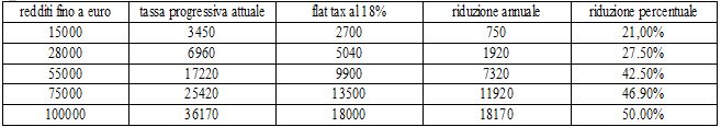 Strettamente connesso al discorso di cui sopra la richiesta di introduzione della “Tassa Piatta”. In realtà la proposta del centrodestra arriva dopo anni in cui regolarmente si sono alzate le tasse ai redditi bassi e diminuite a quelli alti. L’ultima manovra di questo genere è stata opera del governo Prodi che nel 2007 ha alzato la quota minima dal 18% al 23% e ridotto la massima dal 45% al 41% (e nel 1991 era al 50%). La tabella che abbiamo elaborato mostra che cosa accadrebbe se venisse applicata una flat tax al 18% su tutta la popolazione. Non la commentiamo perché è evidente a prima vista chi guadagnerebbe da simile (e incostituzionale) sistema di tassazione che ci fa pensare al capovolgimento della logica di Robin Hood: togliere ai poveri per dare ai ricchi. Ovviamente poi pagheremmo la riduzione del gettito fiscale con ulteriori tagli ai servizi ed un aumento delle tariffe in generale (ticket sulla sanità, tasse scolastiche, trasporti, ecc).